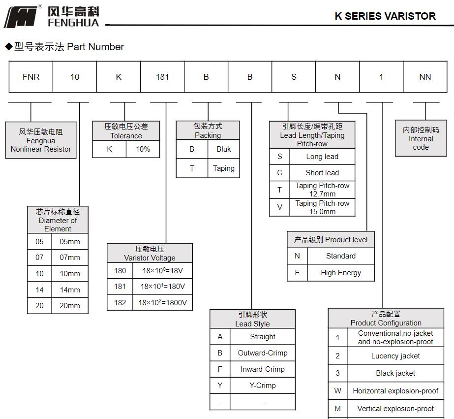 風(fēng)華高科K系列壓敏電阻器型號命名規(guī)則: