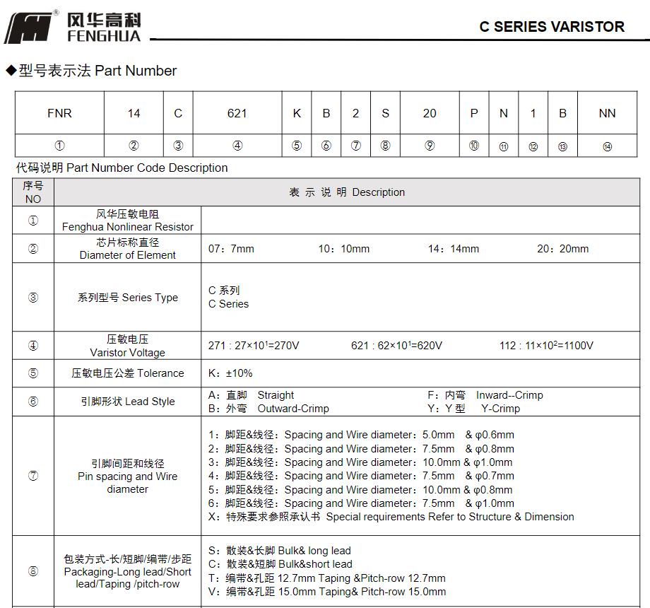 風(fēng)華高科C系列壓敏電阻器型號(hào)命名規(guī)則: