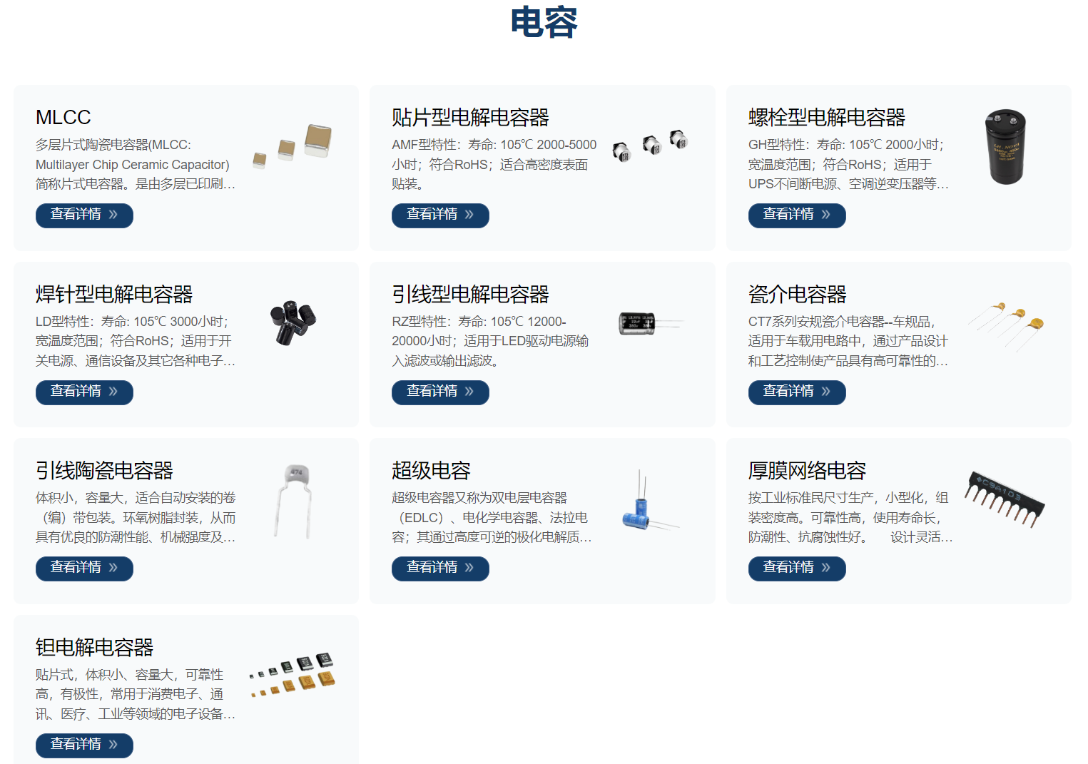 風華電容種類有:多層片式陶瓷電容、貼片型電解電容器、引線型電解電容器、超級電容、瓷介電容器、引線陶瓷電容器、螺栓型電解電容器、焊針型電解電容器、厚膜網絡電容、鉭電解電容器等產品。