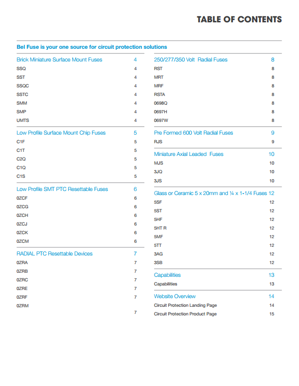1、磚微型表面貼裝保險絲 2、薄型表面貼裝芯片保險絲 3、薄型SMD可復(fù)位器件 4、徑向PTC自恢復(fù)設(shè)備 5、250/277/350伏徑向保險絲 6、預(yù)制600V徑向保險絲 7、微型軸向引線保險絲 8、玻璃和陶瓷保險絲