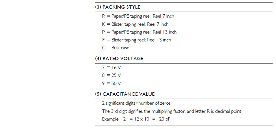 電容公差:B =± 0.1pF;C =± 0.25pF;D =±0.5pF; F =±1%;G =± 2%;J =±5%;K =±10%